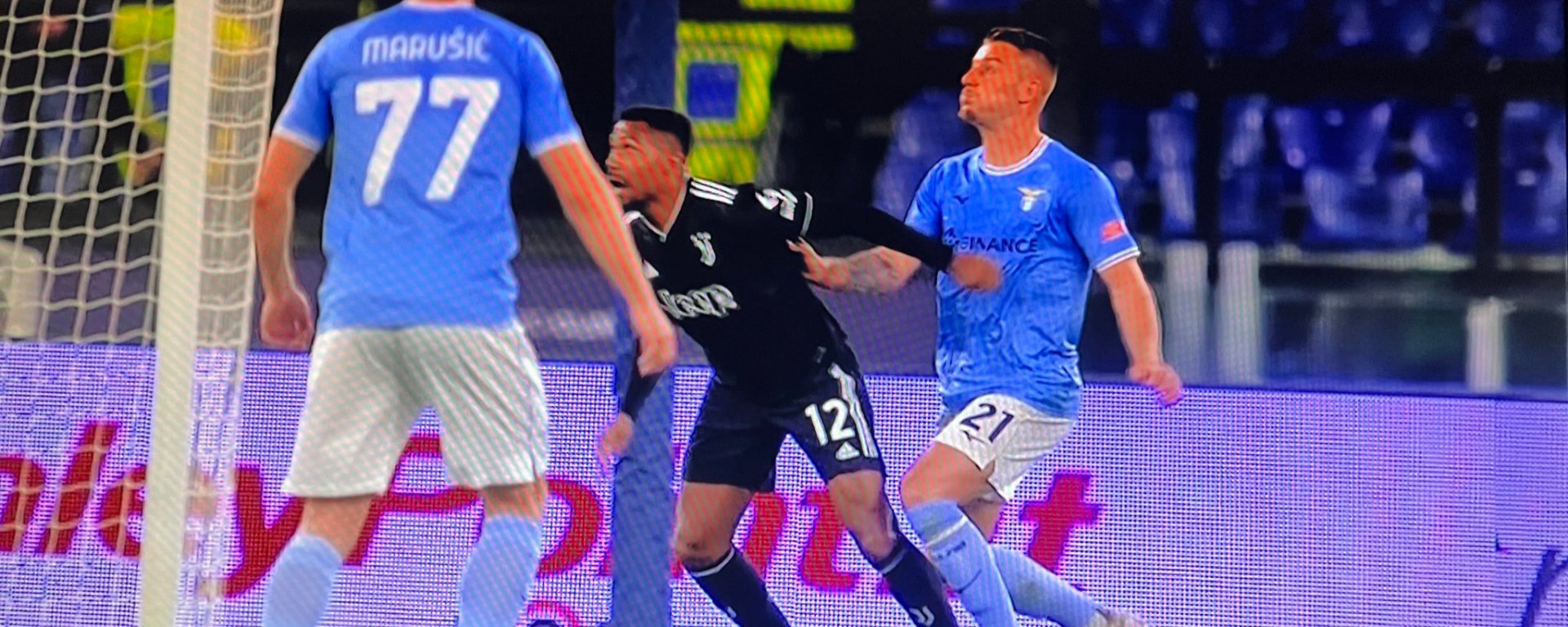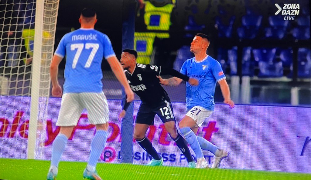 Immagine da Dazn sul goal dell’1-0 di Milinkovic che spinge Alex Sandro (che subisce fallo ma accentua troppo)