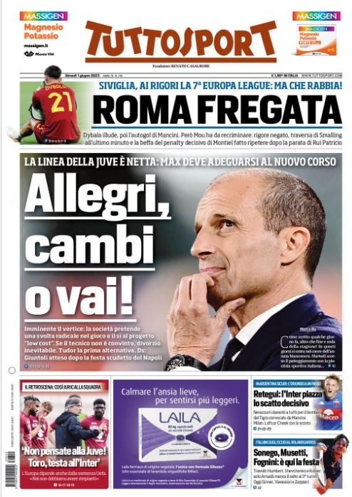 Il titolo di stamani di Tuttosport “Allegri, cambi o vai” suona come barzelletta del giorno o una grandissima presa in giro per i tifosi. Come può Allegri, alla soglia dei 56 anni, con l’atteggiamento e l’attitudine che l’ha sempre accompagnato nella sua carriera, poter cambiare? Dai non prendiamoci in giro e non prendiamo in giro i lettori. E’ come dire a Agnelli cambia il modo di gestire il club. E’ la stessa attitudine. Una assoluta impermeabilità al cambiamento. Solo tanta presunzione e la volontà di dimostrare “ho ragione io!”
