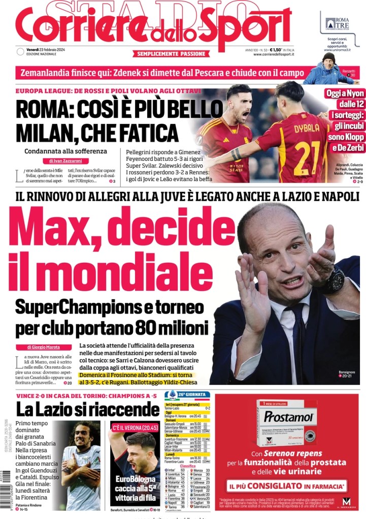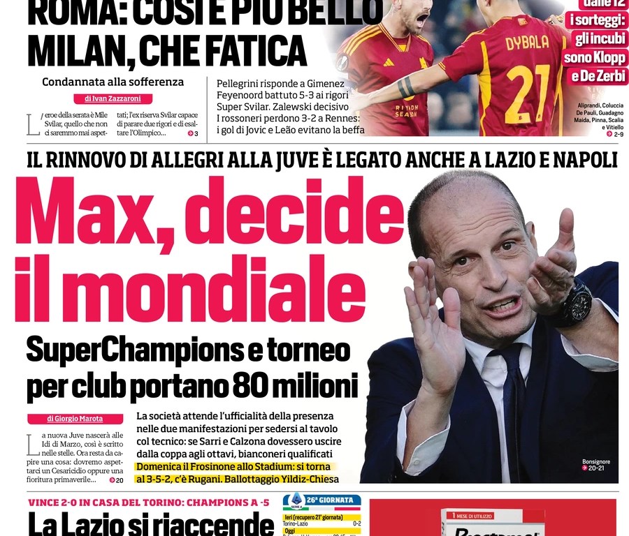 Tenetevi forte, la propaganda allegriana continua a sfornare idee originali, facendo un’altra arrampicata libera sugli specchi: “dopo il discorso del Re” (titolo sul quale ha ironizzato mezza Italia sportiva, pensare solo come sia caduto in basso il nostro amato Tuttosport oramai trasformato in Hurrà Juventus), siamo passati alla teoria (fornita oggi dal Corriere dello Sport) che se la Juventus dovesse andare al Mondiale per Club (comunque non facile visto lo stato attuale del Barcellona…) Allegri sarà confermato per guidarci in questa importante sfida nel 2025, come se il Profeta del calcio in Europa ultimamente abbia mostrato un football Champagne, moderno e organizzato, basato sull’intensità, come se le 4 pere prese dal Benfica (poi stritolato dall’Inter) e le pallonate subite dal Maccabi, proiettassero il calcio allegriano nell’elite internazionale e all’ultima evoluzione del football 2025.
