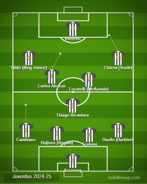 In attacco, confermatissimo Dusan Vlahovic, supportato nel tridente a destra da Chiesa (con Soulé prima alternativa) e Yildiz a sinistra, ma anche con Iling Junior che vola come esterno offensivo a sinistra.